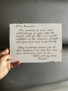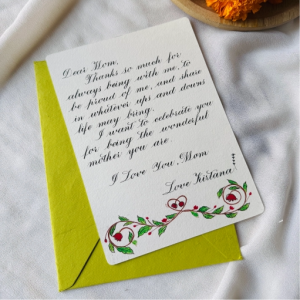 A meaningful message, handwritten in the calligraphy script of your choice—perfect for birthdays, anniversaries, or simply to express what matters most.